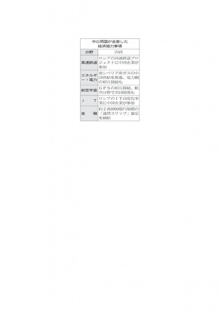 【北京=阿部哲也】中国がロシアとの経済協力の拡充に乗り出す。両国の中央銀行が金融市場の緊急時に自国通貨を相互に融通し合う「通貨スワップ協定」を結んだほか、鉄道やIT(情報技術)、エネルギーなどの分野でも投資・技術協力を進める。いずれもロシアに利点の多い経済連携になっており、欧米による制裁で苦境にあるロシア経済を中国が支える構図が鮮明となっている。「ロシアにとって中国は実質1番(の対ロ投資国)だ」。ロシアのプーチン大統領は14日、モスクワを訪問中の中国の李克強首相と会談し、中国を持ち上げて両国の経済関係がさらに緊密になるとの期待感を示した。中国商務省によると、1~8月の中国の対ロ投資額は前年同期の1.7倍に急増した。中国政府が企業の「走出去(海外に打って出る)」戦略を推し進めているためで、極東や中央アジア地域への進出を目指す中国企業による対ロ投資が活発になっている。足元ではウクライナ問題を巡って欧米が対ロ制裁を発動し、この影響で通貨ルーブルが最安値圏に沈むなどロシア経済は急速に悪化している。このため中国は経済協力という形でロシアへの側面支援を強める。今回の李首相の訪ロで合意した経済協力のうち、目玉の1つとなったのが通貨スワップ協定だ。期間は3年で規模は1500億元(約2兆6000億円)にのぼる。欧米からの制裁でロシアの銀行やエネルギー企業の資金調達環境が悪化していることが背景にあり、中国は潤沢な外貨資金でロシアを支える。中ロ首脳はエネルギーやITなどの分野でも、経済連携を強化することで合意した。5月に締結した総額4千億ドル(約43兆円)の中国向け天然ガス供給契約では、パイプラインの共同敷設を加速する。ロシアで普及が遅れる次世代携帯電話についても、中国の華為技術(ファーウェイ)が技術協力してインフラや端末の導入拡大を促す。いずれも中国側が技術や資金面でロシアを支える経済協力というのが特徴だ。ウクライナ危機に伴う経済制裁で、欧米が資源輸入や技術輸出に制限をかけ、ロシア経済は悪化が続く。中国にとっては今回の対ロ外交でも巨額の経済協力を前面に打ち出し、欧米への「新たな対抗軸」を強調したかった思惑が透ける。