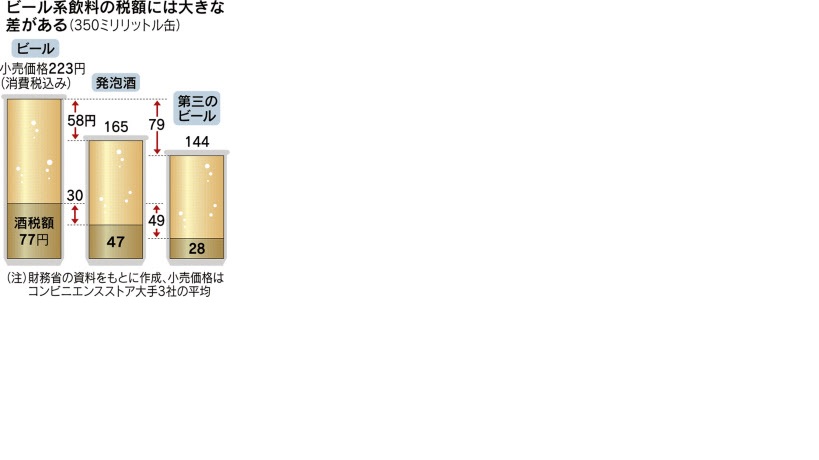 ビール系飲料にかかる酒税は、麦芽の比率など使われている原料に応じて税額に差がある。350ミリリットル缶でビールの税額は77円だが、発泡酒が47円、第三のビールは28円にとどめている。平均小売価格はビールが223円、第三のビールが144円で、この価格差79円のうち、税額による差が約6割を占めている。