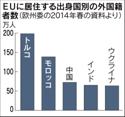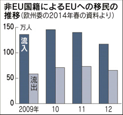 EUの執行機関である欧州委員会が昨春にまとめた資料によると、EUから出て行った人を差し引いた移民の純増数は年間50万~70万人台。EU内に居住する域外の国籍を持つ人は2千万人強で、人口の約4%を占める。