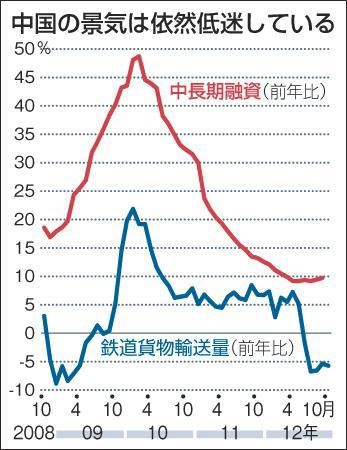 日経にも中国経済の減速記事が載り出すようになってきました。あれだけ中国進出を煽っていたのが様変わりです。7%成長なんてありえないと思います。外国企業の投資誘致と官僚の出世のため、必ず上げ底をしています。前にも書きましたように21兆$もの借金を国の経済主体が負っています。この債務をどのように返済しようとしますか?多分踏み倒すだけでしょう。中国国内でやり合う分にはいいですが、外国企業の債務も勿論踏み倒されるでしょう。みかけ利益が出ている企業は配当、ロイヤルテイで早く資金を日本に還流させた方が良いです。下の若干古い2012年の融資と輸送量のグラフ(夕刊フジより)ですが、趨勢は変わらないと見ていいでしょう。李首相が言ったのは「電力消費、鉄道貨物輸送量、銀行融資を見ないと本当に経済成長しているかどうか判断できない」とのことですが、これを見ますと中国が嘘を言っているのが良く分かります。新規投資は避けるべきで、投下資本を如何に損を少くなくするかを考えた方が良いでしょう。ロイターの記事も似たように書いています。
