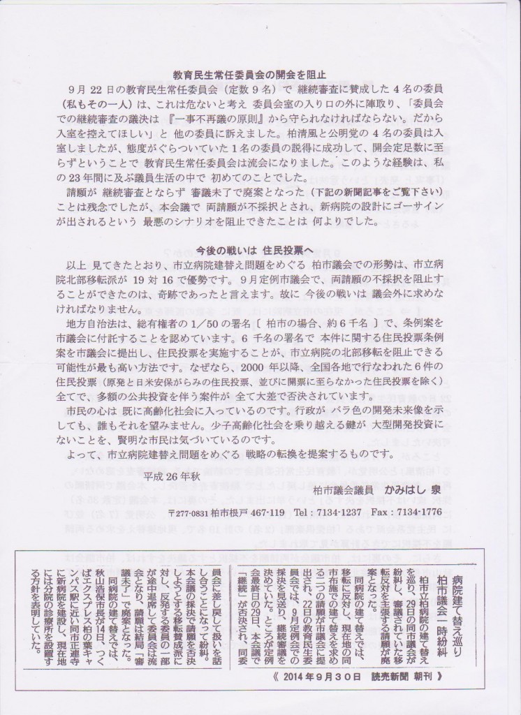 現在の市立病院は「柏市布施1−3」にありますが、秋山市長は「柏の葉キャンパス」駅近くに移転させたいようです。「柏の葉キャンパス」駅の近くには既に「辻仲病院柏の葉」があり、集約するメリットはなく、却って今まで「布施」まで通っていた人(特に布施の近隣にお住いの方)に不便を強いることになります。柏市民の力で移転を食い止め、現在の地に建て替えできるようにしたいです。方法は住民投票です。上橋柏市会議員はこの運動に賛成しております。下のチラシを参照ください。