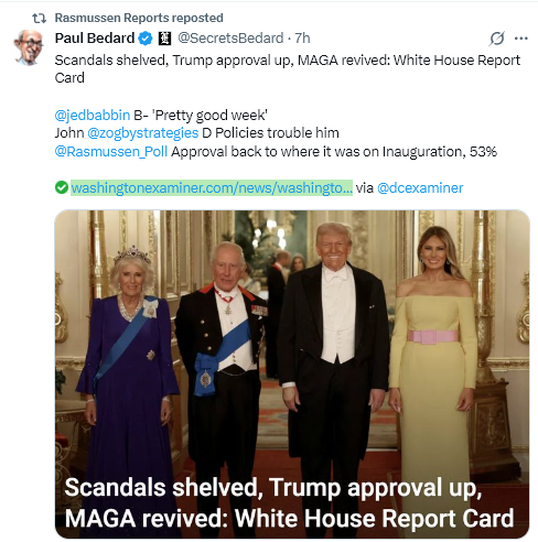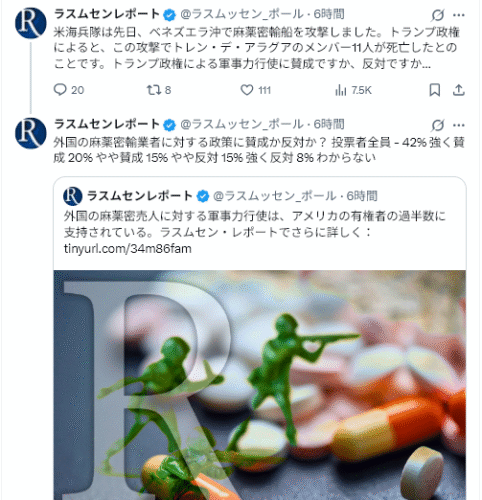ラスムセン・レポートによる最新の全国電話・オンライン調査によると、米国の有権者の48%がトランプ大統領が国家安全保障問題への対応を「良い」または「非常に良い」と評価している一方で、40%は「悪い」と評価している。これらの数字は、 2020年9月のトランプ大統領の評価とほぼ一致しており、 2024年2月に国家安全保障に関する「良い」または「非常に良い」との評価がわずか35%だったジョー・バイデン前大統領を大きく上回っている 。