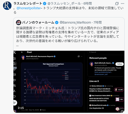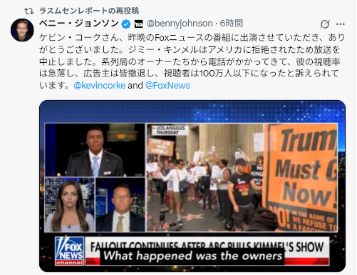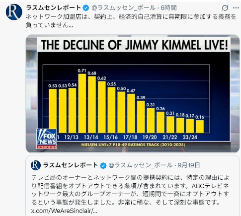 チャーリーカーク暗殺の犯人はトランスジェンダーの恋人がいたというから、左翼思想に凝り固まっていたとみて良い。ジミー・キンメルがこの件でMAGAを悪者のように言うのはお門違い。左翼と中国人は論理のすり替えと責任転嫁が得意。ジミー・キンメルの政治的発言は視聴率という市場のチエックメカニズムを通して評価され、やがて淘汰されていくのでは。