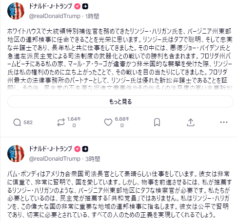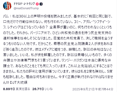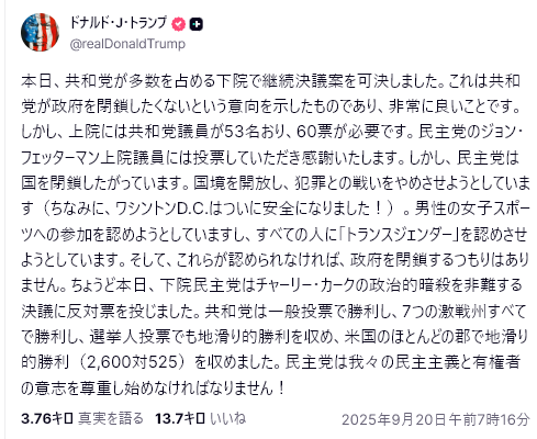 トランプ氏はTruth Socialに投稿した声明で次のように書いている。