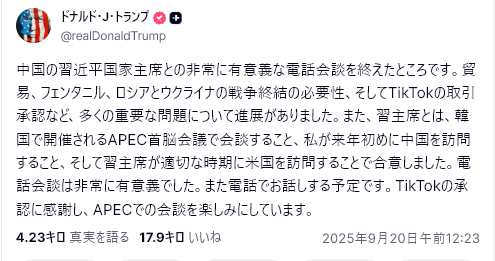 9/28阿波羅新聞網<WSJ:习近平锁定川普 逼美国干这事?=WSJ:習近平はトランプを標的にし、米国にこれを強制しているのか?>アポロネット王篤若の報道:トランプ米大統領は25日、大統領執務室でTikTokに関する大統領令に署名した。WHは、米国版TikTokは米国産のアルゴリズムモデルを採用すると発表した。この合意は、米中関係の最近の雪解けの兆候と見られている。しかし、WSJが9/27に独占報道したところによると、中共の習近平は、トランプとの経済協定締結を餌に米国の対台湾政策を変えさせ、米国に「台湾独立反対」の姿勢を表明させ、台湾を徐々に孤立化させようとしているという。