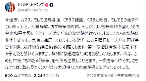 トランプ大統領が発表した今回のガザに関する和平計画の合意は、過去2年間続いてきたガザの惨状をようやく反転させる最初の重要なステップです。