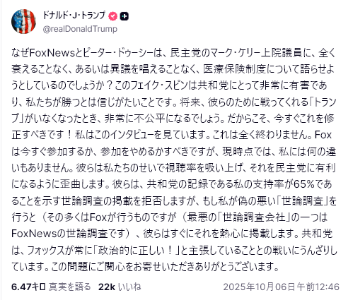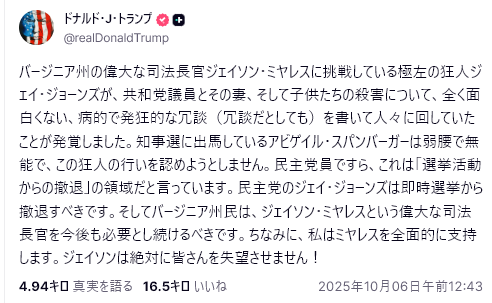 10/1、トランプは「トルースソーシャル」プラットフォームに投稿し、主に以下の点を訴えた。