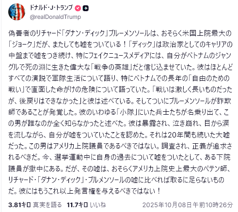 「ジョー・バイデン政権下で、このようなことが起きていた。米国上院議員がスパイされていた。当時の大統領の政敵であった元大統領たちが標的となり、起訴された。」