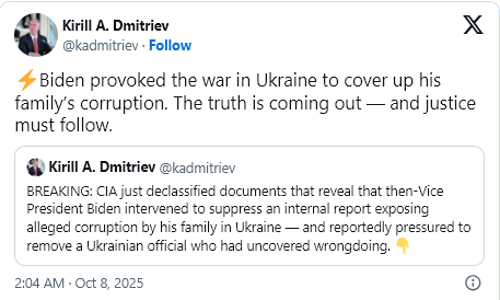 キリル・ドミトリエフ氏は、ジョー・バイデン氏が、ウクライナにおけるバイデン一族の汚職疑惑を暴露したCIA報告書の公表を阻止するために介入したという月曜日の報道を受け、自身のXアカウントに複数のツイートを投稿した。報道によると、バイデン氏は不正行為を暴露したウクライナ当局者を解任するよう圧力をかけたという。
