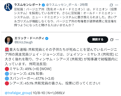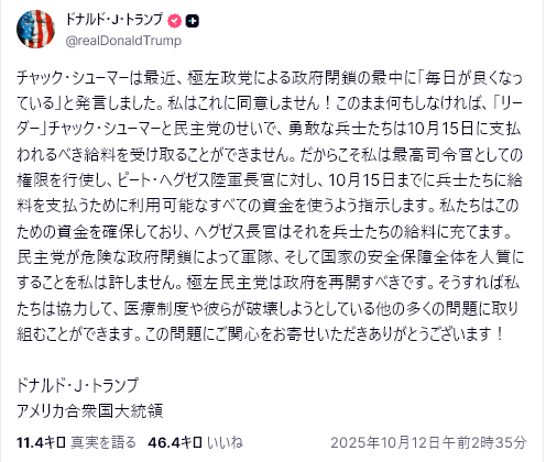 10/11阿波羅新聞網<对中共狠招在路上!他预告:俄乌战争很快结束=中共に対する強硬な戦術が迫る!彼は予告:ロシア・ウクライナ戦争は間もなく終結すると>トランプ米大統領は、イスラエルとパレスチナ武装組織ハマス間の和平案の第一段階を後押しし、和平交渉の次の目標はロシア・ウクライナ戦争だと述べた。9日のインタビューで、ベセント米財務長官は、ロシア産原油の購入を理由に中国(中共)にも制裁関税を課せば、戦争は間もなく終結するだろうと述べた。