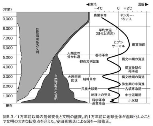 人類が大きな転換点を迎えたのが、約1万年前である。それ以前の地球は寒冷気候できわめて暮らしにくかったのだが、1万年ほど前に地球全体が温暖化したのである(図6-31万年前以降の気候変化と文明の盛衰)。