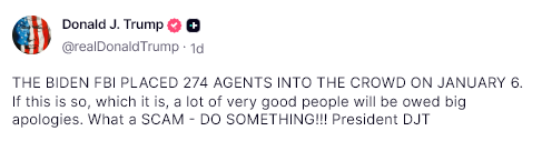 10/13The Gateway Pundit<“DO SOMETHING!” – President Trump Once Again Calls Out Pam Bondi to Take Action After News Breaks of 274 FBI Agents at Jan. 6 Fedsurrection=「何か行動を起こせ!」-トランプ大統領は、1/6の連邦組織の暴動でFBI捜査官274人が活動していたというニュースを受けて、再びパム・ボンディに行動を起こすよう呼びかけた>