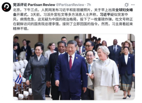 10/13、中共の習近平主席は北京で開催された世界女性サミットの開会式に出席し、基調講演を行った。ライブ映像には、演説中の習近平の無表情で元気のない声が映っていた。これに先立ち、トランプ米大統領は習近平国家主席が「困難な時に遭っている」と発言し、憶測を呼んでいた。