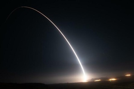 米カリフォルニア州にあるバンデンバーグ宇宙軍基地から発射された大陸間弾道ミサイル「ミニットマン3」。約6800キロ離れたマーシャル諸島にある米陸軍宇宙ミサイル防衛司令部の弾道ミサイル防衛試験場に正確に着弾した(8月11日、米陸軍のサイトより)