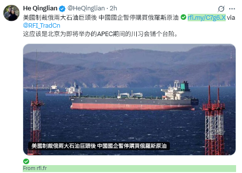 米国がロシアの大手石油会社2社に制裁を発動したことを受け、中国の国有企業はロシア産原油の購入を停止した。 https://rfi.my/C7g6.X via @RFI_TradCn
