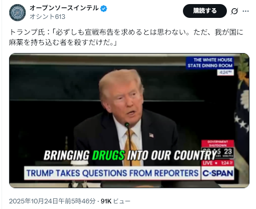 これは、トランプ大統領が麻薬カルテルとの戦いの一環としてベネズエラ国内でのさらなる軍事行動を検討している中で起こった。
