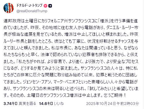 「私は二つの理由で承認した」と彼は述べた。ベネズエラはバイデン政権下で「国境開放」政策を「最も悪用した国」であり、「刑務所、精神クリニック、キチガイ収容所」を空にして彼らを米国へ送り込んだと彼は述べた。