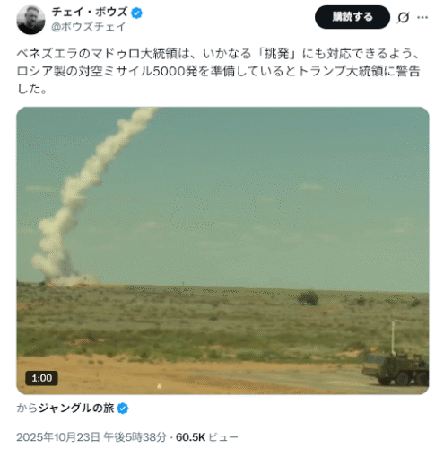 10/23The Gateway Pundit<Defiant Venezuelan Dictator Maduro Threatens the US, Claims He Has 5,000 Anti-Aircraft Missiles to Fight (VIDEOS)=反抗的なベネズエラの独裁者マドゥロが米国を脅迫、対抗できる対空ミサイル5000発を保有していると主張(動画)>