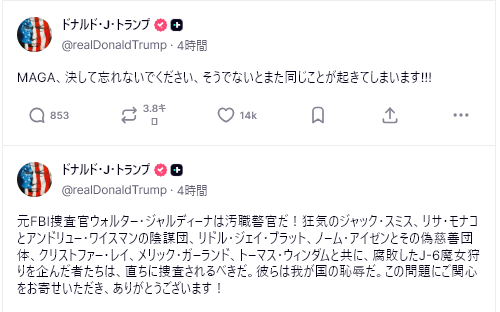 「元FBI捜査官ウォルター・ジャルディーナは汚職警官だ! 狂気のジャック・スミス、リサ・モナコとアンドリュー・ワイスマンの悪意あるチーム、リドル・ジェイ・ブラット、ノーム・アイゼンとその偽チャリティ、クリストファー・レイ、メリック・ガーランド、トーマス・ウィンダムと共に、腐敗したJ-6魔女狩りを企んだ者たちは、直ちに捜査されるべきだ」とトランプ氏は述べた。