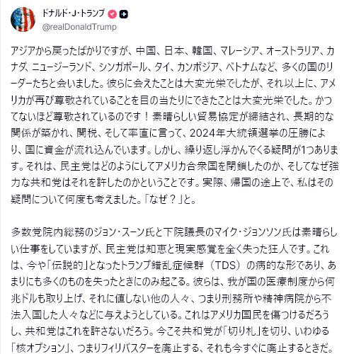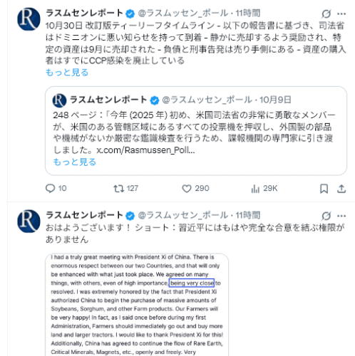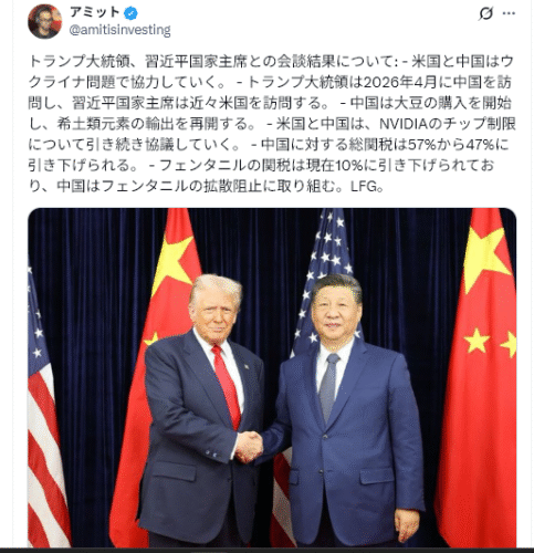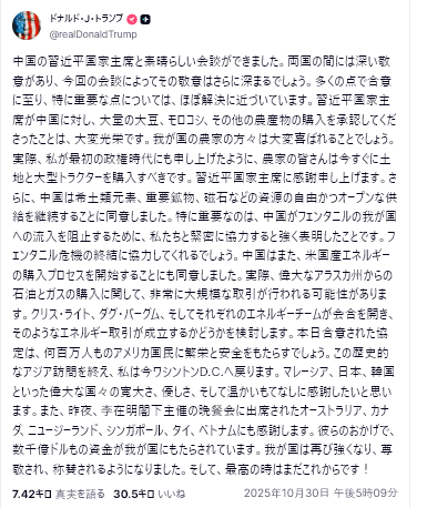 トランプ・習会談結果:トランプは非常に満足しており、習近平国家主席を偉大な指導者と称した。米国が得たもの:レアアース、農産物、エネルギー購入における成果。中国が得たもの:相互関税とペナルティ措置の1年間の延期。1年以内に両国は友好関係を維持し、台湾は…