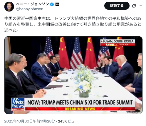 10/31看中国<川习会习三大让步 美中“斗而不破”藏变局(图)=トランプ・習会談における習の3つの譲歩:米中「闘っても打ち負かさず」は転換点を示唆(写真)>トランプ米大統領と中共中央委員会主席の習近平は10/30、韓国・釜山の金海国際空港で二国間会談を行った。これはトランプがWHに戻って以降、初めての対面での対話となった。会談は約1時間40分にわたり、貿易関税、レアアース輸出、フェンタニル危機、台湾問題などに焦点が当てられた。表面上、双方は「暫定的な枠組み合意」に達し、トランプは来年4月の中国訪問の招待を受け入れた。一部の評論家は、今回の「トランプ・習近平会談」は習近平の「闘っても打ち負かさず」戦略の再度の失敗であり、口先では強硬だが内面は軟弱という「降伏」姿勢を露呈したものだと考えている。米中関係は表面上では緩和しているが、実際にはより大きな嵐が吹き荒れている。