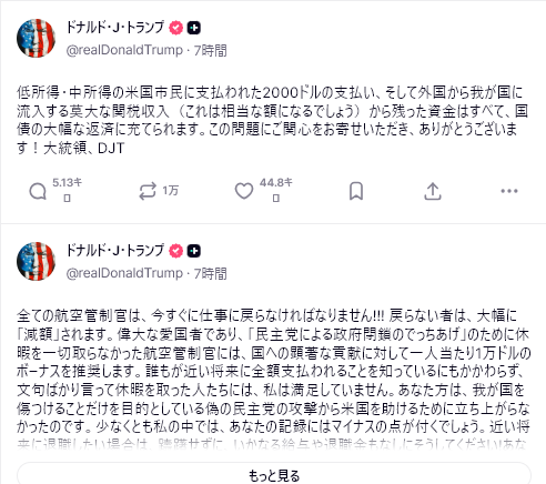 「トランプは関税収入を使って米国民に金銭を支給することを提案した」。トランプはソーシャルメディアで関税による収入を称賛し、政府はまもなく国債の返済を開始すると述べた。また、高所得者を除くすべての人が少なくとも2,000ドルを受け取ると述べた。