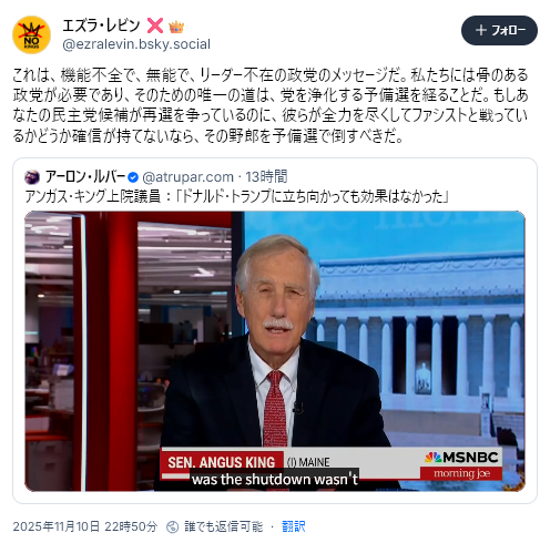 11/10The Gateway Pundit<MASSIVE Leftist Meltdowns Ensue as Eight Senate Democrats Cave and Vote to End Government Shutdown – Here Are Some of the Biggest Ones=上院民主党議員8人が屈服し、政府閉鎖の終了に投票したことで、左派の大規模なメルトダウンが発生。その最大のものをいくつか紹介する。>