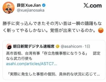 問題の薛剣氏の「戦狼」発信は、朝日新聞デジタル速報席がXに投稿した記事「高市首相、台湾有事『存立危機事態になりうる』 認定なら武力行使も」を引用して、8日に投稿。「勝手に突っ込んできたその汚い首は一瞬の躊躇もなく斬ってやるしかない。覚悟が出来ているのか。」と従来通り日本語で発信しており、文末には怒り顔の絵文字も添えられていた。