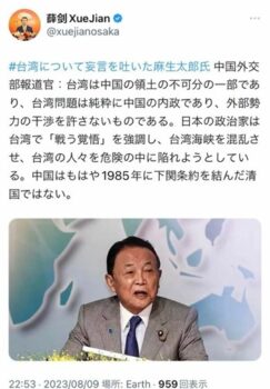 例えば麻生太郎氏が2023年8月に自民党副総裁として台湾を訪れ、フォーラムの席上、台湾海峡の安定のために、「今ほど日本、台湾、米国をはじめとした有志国に強い抑止力を機能させる覚悟が求められている時代はない。戦う覚悟だ」などと語った際には、「台湾について妄言を吐いた麻生太郎氏」とのハッシュタグを付け、「日本の政治家は台湾で『戦う覚悟』を強調し、台湾海峡を混乱させ、台湾の人々を危険の中に陥れようとしている。中国はもはや1985年(ママ。正しくは1895年)に下関条約を結んだ清国ではない」と、西暦を誤記したまま批判投稿。