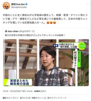 またその翌月には香港情勢などに詳しい東京大学の阿古智子教授のテレビでの評論について、「中国のことに全く無知ながら学者風の顔をして、新疆・香港・チベット等について嘘・デマ・憎悪をテレビなどを通じて大量販買(ママ)して、日本の中国ウォッチングを濁している巨悪知識人の一人」と槍玉にあげ、選挙で選ばれた政治家や、有識者らを名指ししての個人攻撃発信も常態化させていた。