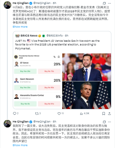 11/6、ブッシュ政権に入った共和党員のダグラス・マッキノンは、「クロケットとAOCに注目するのはやめよう:2028年の民主党を率いるのはスパンバーグとシェリルだ」と題する記事を掲載し、バージニア州とニュージャージー州で新たに選出された民主党女性知事2人を「冷静で現実的であり、今日の多くの民主党指導者に見られるような憎悪に満ちたレトリックは全くなく、明らかに党派を超えて共和党支持を取り付けようとしている」と称賛した。