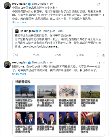 米国は、ラテンアメリカ4カ国からのバナナ、コーヒー、その他の製品に対する関税を引き下げる。この動きは、消費者物価上昇と今月の最高裁の公聴会後の法的不確実性の中で、いわゆる相互関税の一部を薄めることを目的としたトランプ政権の政策転換の一環である。 https://cn.wsj.com/articles/%E7%BE%8E%E5%9B%BD%E5%B0%86%E9%99%8D%E4%BD%8E%E5%AF%B9%E6%9D%A5%E8%87%AA%E6%8B%89%E7%BE%8E%E5%9B%9B%E5%9B%BD%E7%9A%84%E9%A6%99%E8%95%89-%E5%92%96%E5%95%A1%E7%AD%89%E4%BA%A7%E5%93%81%E7%9A%84%E5%85%B3%E7%A8%8E-a72dfdd1