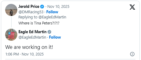 11/14The Gateway Pundit<Alert: After Announcing Huge Trump Pardons, Ed Martin Turns His Attention to Tina Peters, the Wrongly Imprisoned Election Integrity Hero=警告:トランプ氏の大規模な恩赦を発表した後、エド・マーティンは不当に投獄された選挙の公正さの英雄、ティナ・ピーターズ氏に注目する>