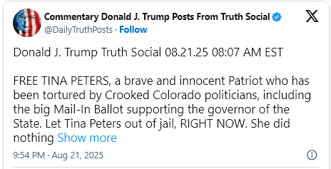 ドナルド・トランプ大統領は、Truth Social での激しい非難の中で自らの立場を明確にし、フォロワーに「ティナ・ピーターズを解放しろ!」と呼びかけた。