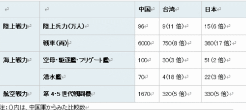 表 中国軍と台湾軍・日本の自衛隊の近代的な主要兵器の比較