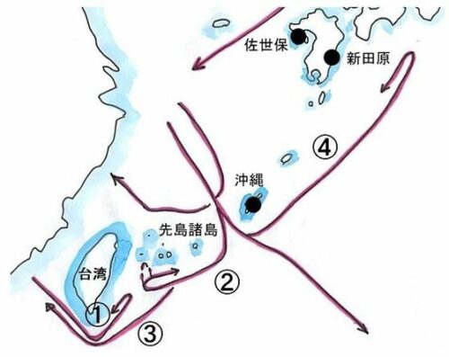 この場合、艦艇・空軍機は必ず日本の南西諸島を通過するし、空母群も同じ経路を通過して、南西諸島の東側などに進出するだろう。
