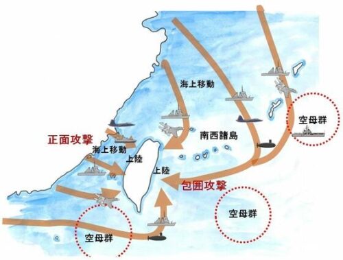 中国軍は、正面からの攻撃を行うと、艦艇や空軍機の被害が膨大なものとなるために、台湾の東側に回る迂回攻撃が主攻撃となるであろう。