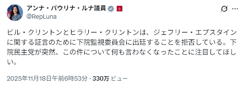 11/19阿波羅新聞網<中日关系紧张 她再补刀=緊迫する日中関係、彼女がとどめを刺す>日中関係の緊張により、北京は国民に対し、外交紛争中の日本への渡航を控えるよう勧告した。多くの中国国民が日本行きの航空券をキャンセルし、約50万枚の航空券がキャンセルされたという報道もある。しかし、小野田経済安保相は記者会見を開き、「ちょっと不快なことが原因ですぐ経済的圧力を訴える国に過度に依存することは、サプライチェーンだけでなく観光産業も危険にさらすことになる」と述べた。これを受け、金融KOLの胡采蘋は、日本の女性政治家は「ますます立派になっている」と称賛した。