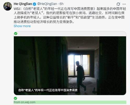 WSJ:「自らを『ネズミ人間』と呼ぶ若い世代が、中国の消費チャートを書き換えている」。ますます多くの若い中国人が、狭い部屋に閉じこもり、社交を避け、長時間ベッドに横になってスマホをスクロールする「ネズミ人間」になることを選んでいる。 「寝そべり」と「低欲求」のライフスタイルの拡大は、消費主導の経済成長を促進する中国の取り組みを複雑化させている。