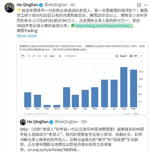 👇 この投稿は、中国の若年層の就職難によって引き起こされた「ネズミ人間」(若者の失業)現象について言及している。世界最大の大国である米国の状況は以下の通り:米国労働統計局が11/20に発表した月次データによると、25歳以上で学士号以上の学位を持つ失業者数は9月に190万人を超え、全米の失業者数の4分の1を占め、1992年の統計開始以来、最も高い割合となった。