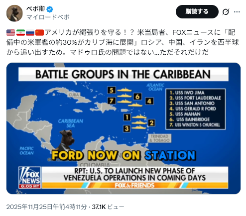 11/26The Gateway Pundit<US Military Deployment in Latin America Isn’t Just About Venezuela, But to Push Russia, China and Iran Out of the Western Hemisphere (VIDEO)=米軍のラテンアメリカ展開はベネズエラ問題だけでなく、ロシア、中国、イランを西半球から追い出すためでもある(動画)>
