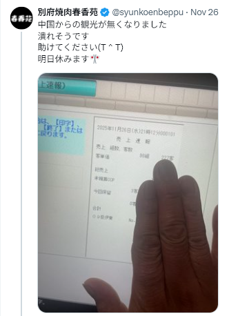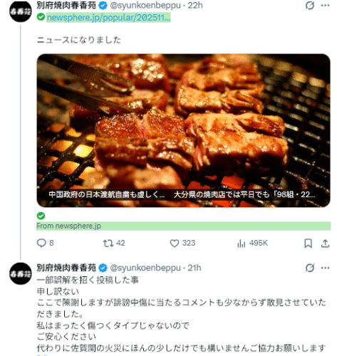 飲食店「別府焼肉 春香園」は、11/26の売上高をソーシャルメディアで発表した。98組227人の来店客があったという。また、中国人観光客の減少を冗談交じりに嘆き、店が倒産寸前だと訴え、泣き顔の絵文字を添えて助けを求めるメッセージを掲載した。その後、コメント欄で謝罪し、この投稿が多くの人を誤解させたと述べた。