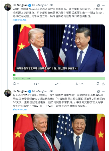 WSJの報道を信じない人もいるため、別の情報源を紹介する:ドイツの声・中国語:ベセント米財務長官は11/25、CNBCのインタビューで「トランプ大統領が釜山での両首脳の歴史的な会談から30日後にこの電話会談を主導した。両国の関係は非常に良好だ」と述べた。