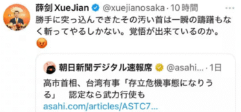 (第三ステップ)中国の在阪総領事が、当該朝日新聞記事を引用しつつ、「勝手に突っ込んできたその汚い首は一瞬の躊躇もなく斬ってやるしかない。」とツイート。