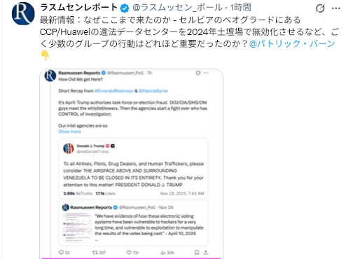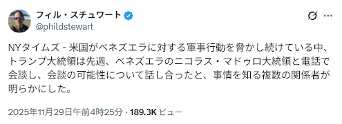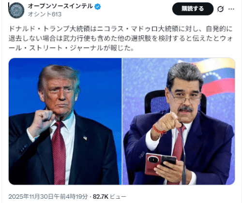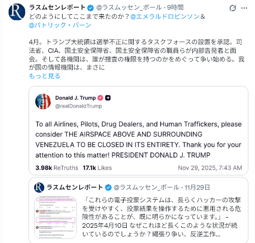 11/29The Gateway Pundit<Venezuela Issues Statement After President Trump Orders All Aircraft to Avoid Regime-Controlled Airspace=トランプ大統領がベネズエラの空域を全航空機に回避するよう命じたことを受け、ベネズエラが声明を発表>