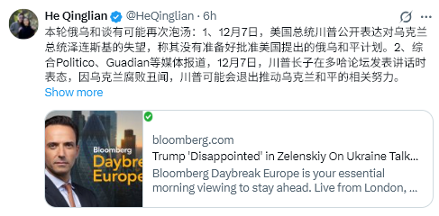 今回のロシア・ウクライナ和平交渉は再び失敗に終わる可能性がある:1. 12/7、トランプ米大統領はゼレンスキー・ウクライナ大統領への失望を公に表明し、米国が提案したロシア・ウクライナ和平案を承認する準備ができていないと述べた。 2. ポリティコ、ガーデイアンなどの報道によると、トランプの長男は12/7、ドーハ・フォーラムで、ウクライナの汚職スキャンダルを理由にウクライナ和平促進への取り組みからトランプが撤退する可能性があると述べた。