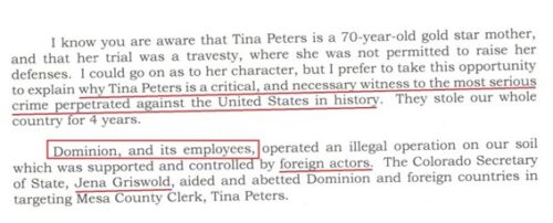 ティナ・ピーターズ氏の弁護士ピーター・ティックティン氏は、トランプ大統領に送ったティナ・ピーターズ氏への恩赦要請書を公開した。恩赦の理由は、ティナ氏が米国史上最も重大な犯罪の目撃者であるためだ。