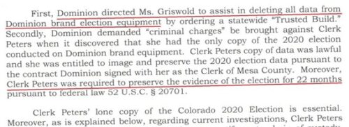2020年の選挙後、コロラド州務長官の指示によるシステムアップデート後に郡の選挙結果が変更されたことに気づいたピーターズ氏は、当局と市民にその事実を報告しました。ティナ・ピーターズ氏は州法および連邦法に従い、アップデート前の選挙結果のコピーを保存していたため、懲役9年の刑に処されました。彼女は職務遂行のために投獄されたのです。