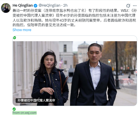 南京塩ダック(彼女はホーチョルNY州知事の副首席補佐官で中国駐NY総領事に塩ダックをねだり、家に届けさせていた)の名声を博した孫雯事件は、暫定的な結論に達した。 WSJ:「中国代理人として起訴された孫雯の裁判は審理無効に」。孫雯(41歳)は、中国代理人登録の不履行、詐欺、贈賄などの罪に問われている。彼女と43歳の夫、胡驍は共に裁判にかけられており、胡驍は詐欺と脱税の罪に問われている。しかし、陪審は全員一致の評決に達することができなかった。