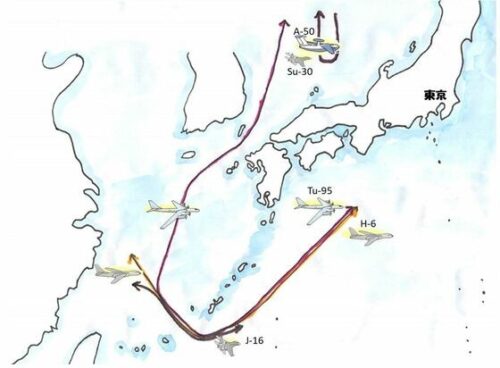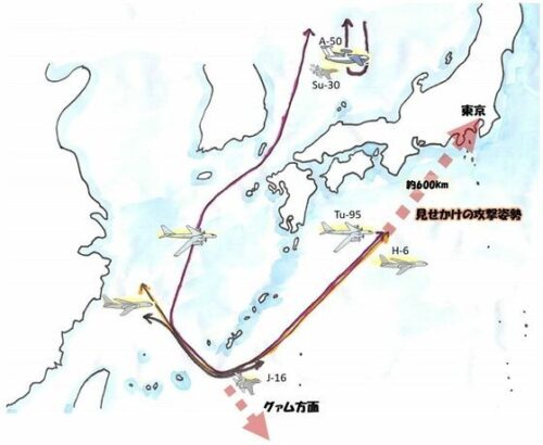 中国とロシアの爆撃機が宮古海峡を通過した後の飛行方向と折り返し地点を見ると、東京の手前約600キロで、東京に向けてミサイルを発射し、その後、中国に引き返す想定であるように見える。